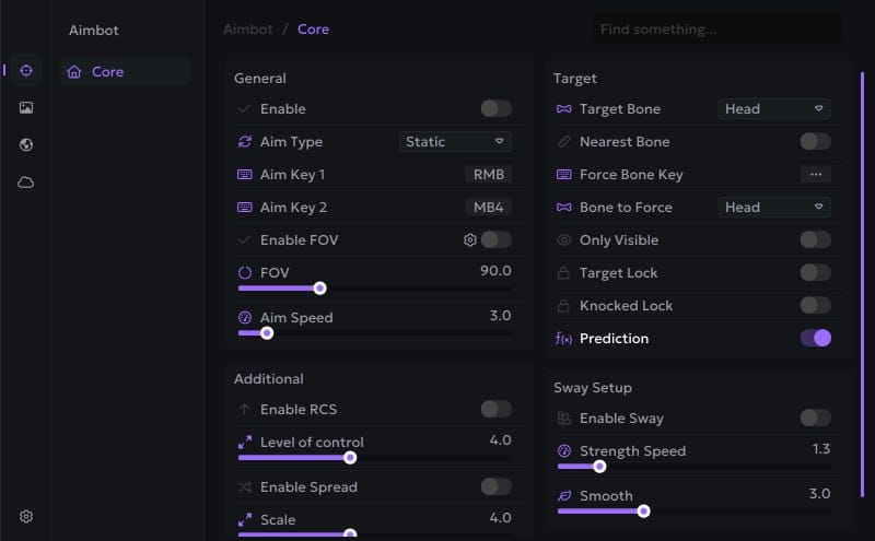 - FOV: Adjust the aiming radius in which targets are detected.