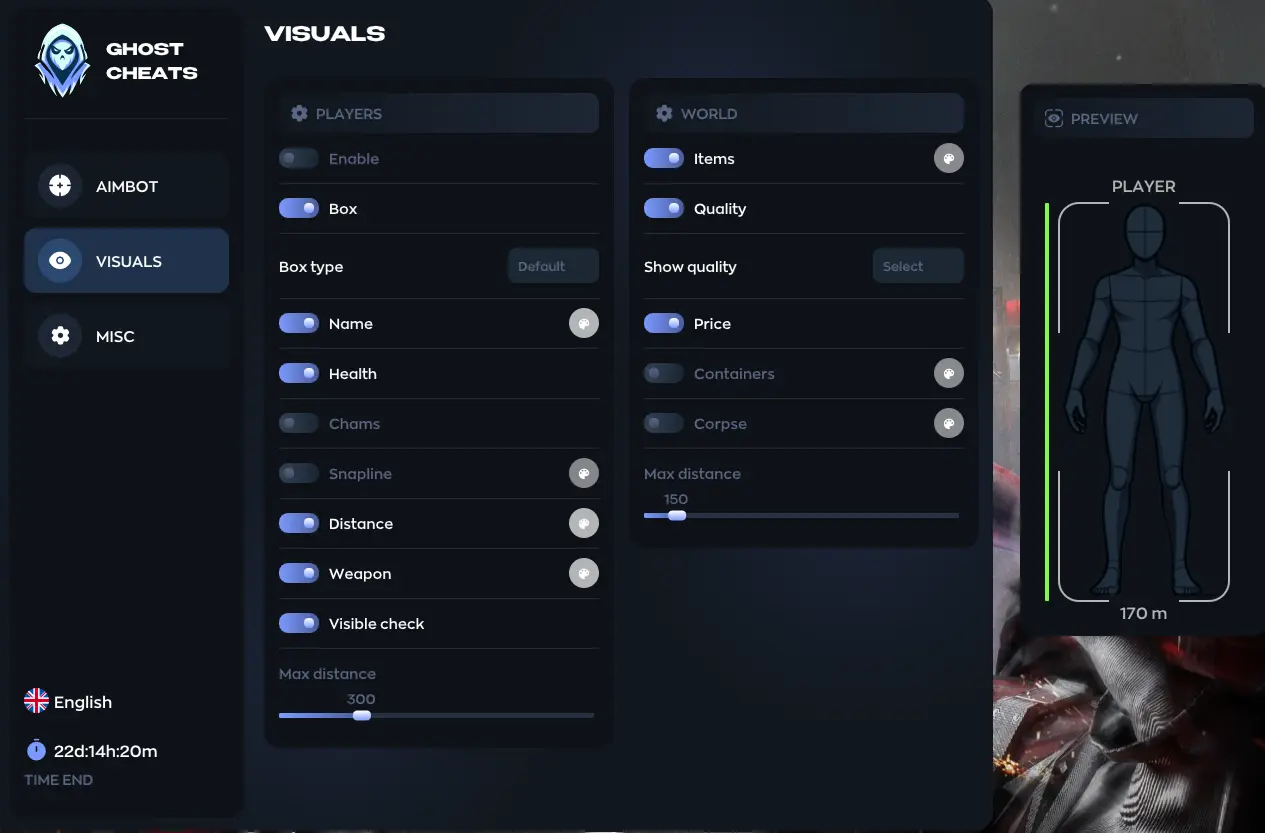 - Max Distance — set loot ESP range