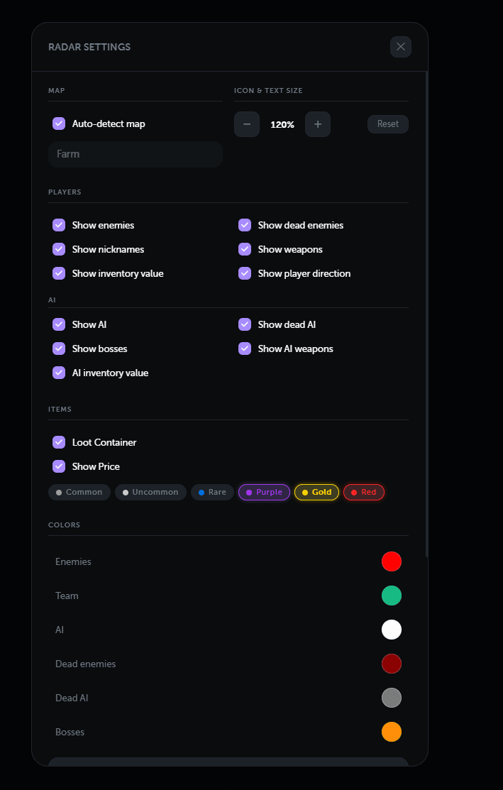 With instant updates and clear visual separation between enemies, teammates, and AI, you always know exactly what’s happening around you. Advanced filtering lets you control what you see, from rarity-based loot to specific entities, while full color customization keeps everything easy to read at a glance.