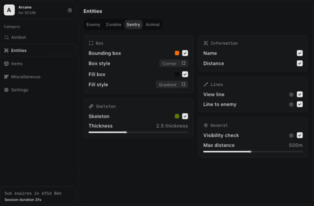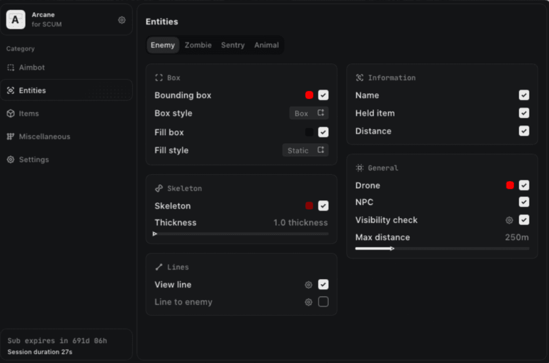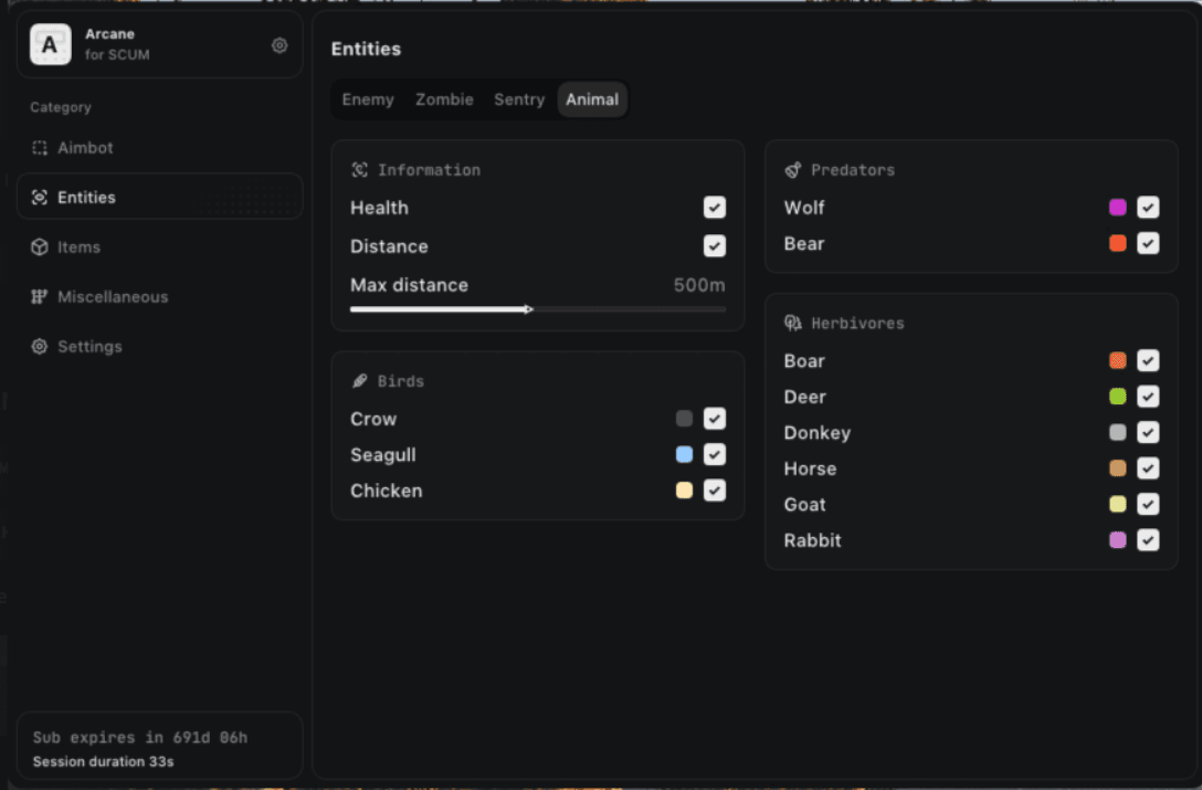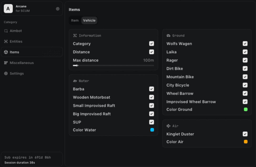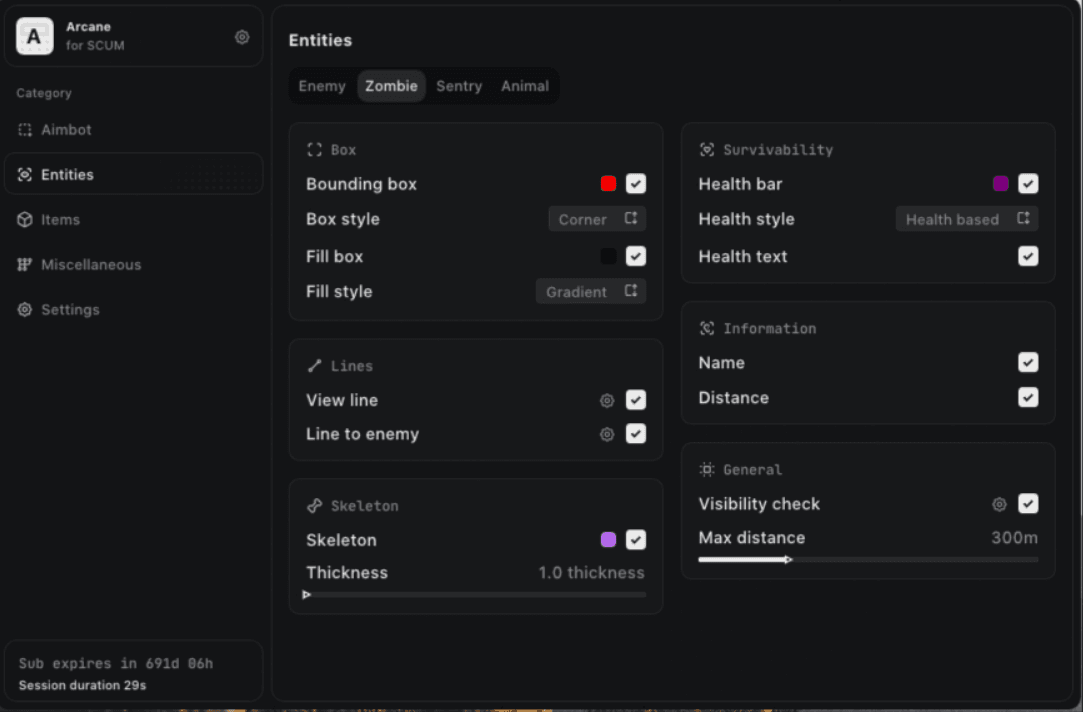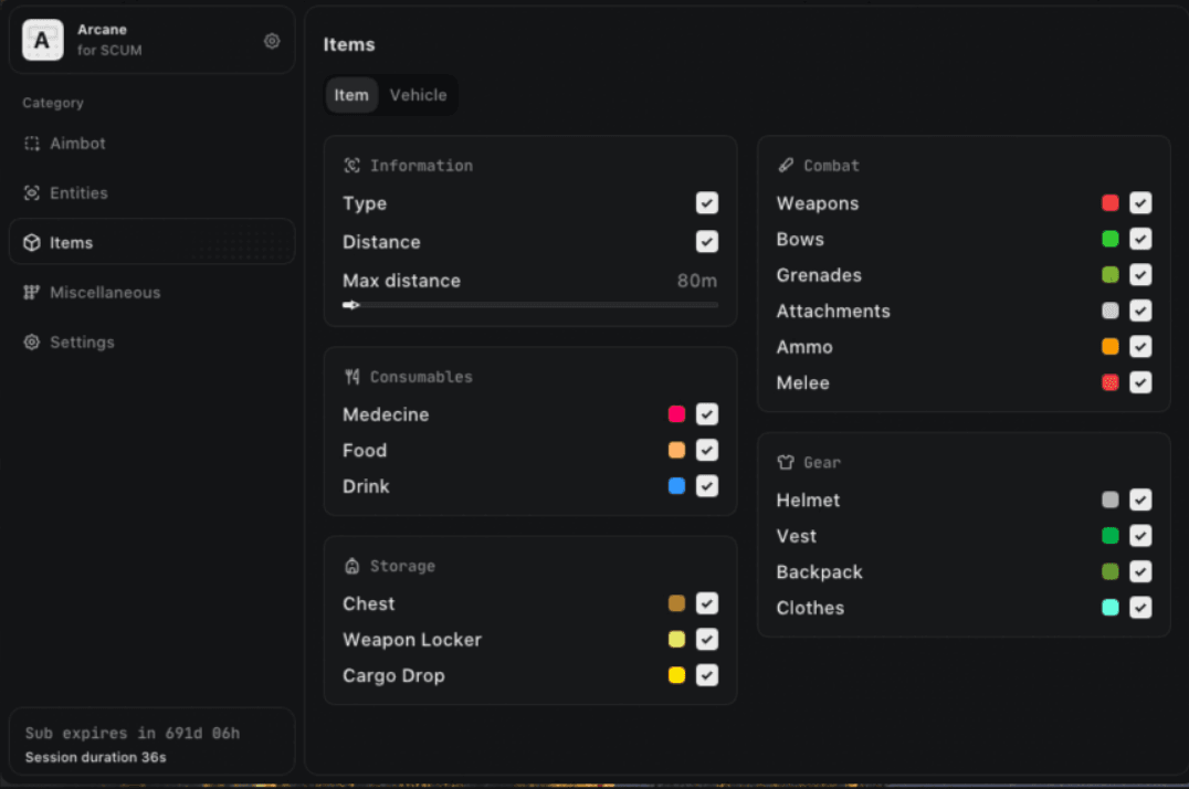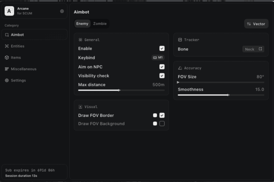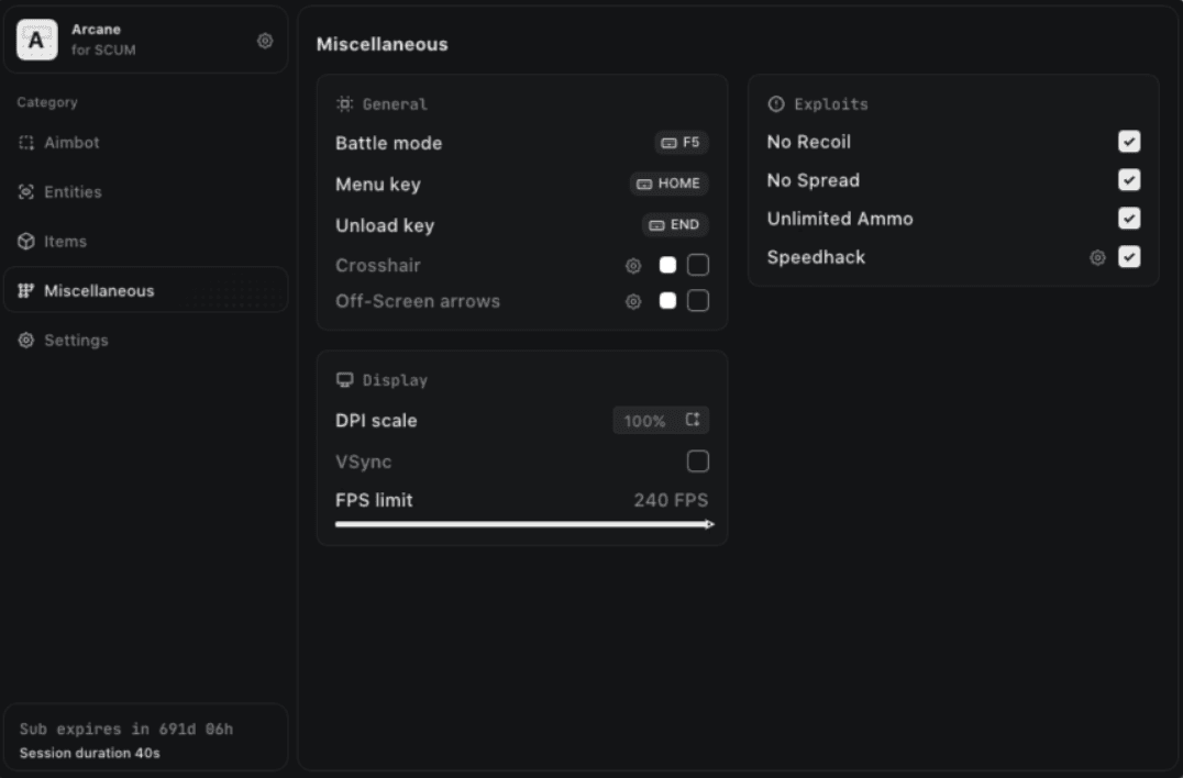 Scum Cheat Arcane is a private solution designed for control and awareness. It includes a smooth vector aimbot with prediction and recoil control, detailed ESP for players, NPCs, and animals, plus item and vehicle ESP for full map visibility. With added features like no recoil, no spread, and battle mode, it delivers a stable and efficient gameplay experience.
